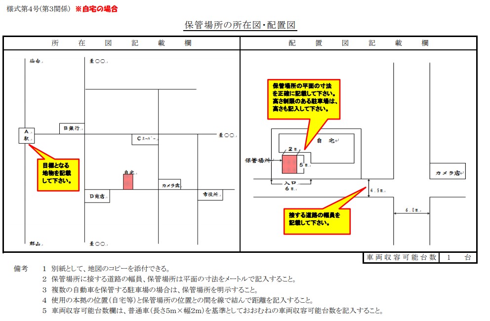 上記の書き方は保管場所=居住地でしたが、下記は保管場所と居住地の距離が離れている場合です。