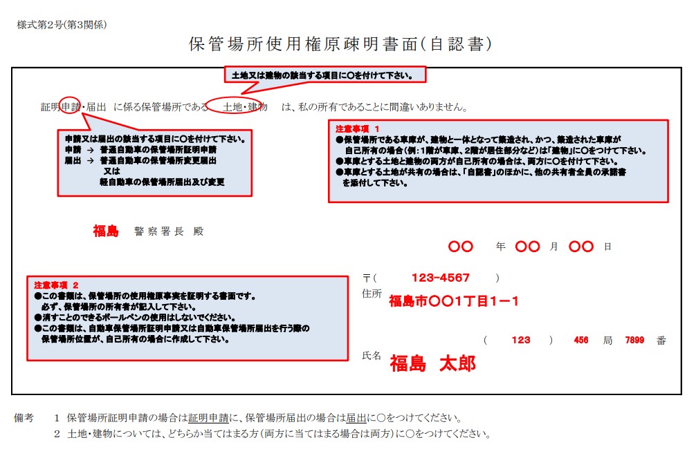 「保管場所の位置」「使用者」「使用期限」はご自身で記入し、保管場所の所有者(親、大家さんなど)・管理権(不動産管理会社など)を持つ方に署名をもらいます。